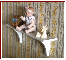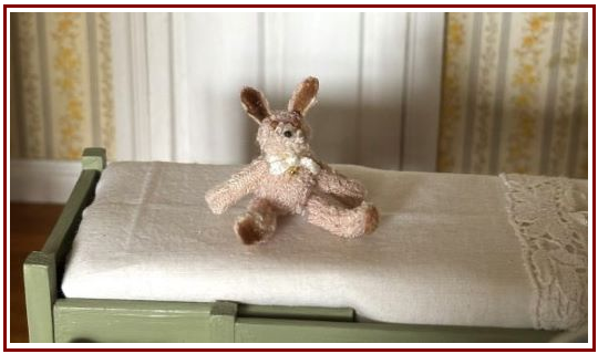A single bed, sits beneath a shelf where porcelain dolls rest quietly, watching over the room. On the bed, a plush bunny sits. Nearby, a teddy bear waits patiently on the polished wooden floor, its presence reassuring and familiar.